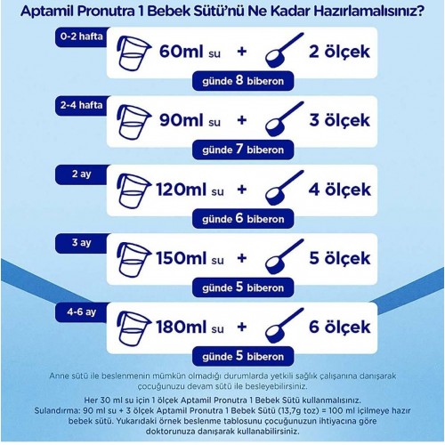 Aptamil Pronutra 1 Bebek Sütü Nasıl Hazırlanır? Aptamil Pronutra 1 Bebek Sütü’nü hazırlarken, her 30 ml su için 1 ölçek Aptamil 1 Bebek Sütü kullanmalısınız. Aşağıdaki örnek beslenme tablosunu bebeğinizin ihtiyacına uygun sıklıkta doktorunuza danışarak kullanabilirsiniz.
