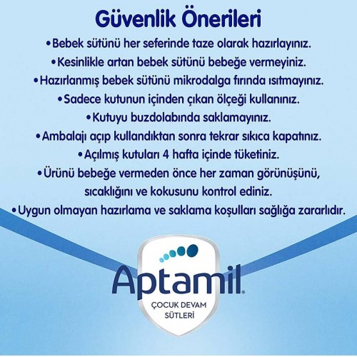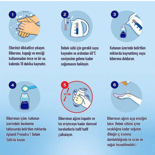 Hazırlama: 30 ml su + 1 ölçek Aptamil Pronutra 1 Bebek Sütü 60 ml su + 2 ölçek Aptamil Pronutra 1 Bebek Sütü 90 ml su + 3 ölçek Aptamil Pronutra 1 Bebek Sütü 120 ml su + 4 ölçek Aptamil Pronutra 1 Bebek Sütü 150 ml su + 5 ölçek Aptamil Pronutra 1 Bebek Sütü 180 ml su + 6 ölçek Aptamil Pronutra 1 Bebek Sütü Aptamil Pronutra 1 Bebek Sütü Nasıl Yapılır? Öncelikle ellerinizi yıkayın. Biberonu, kapağı ve emziği kullanmadan önce temizleyin ve bir su kabında 10 dk kaynatın. Aptamil Pronutra 1 Bebek Sütü’nü hazırlamak için kullanacağınız suyu 10 dakika kaynatıp, 40 derece seviyesine kadar soğumasını bekleyin. Kaynatılmış ılıtılmış suyun beslenme tablosunda belirtilen miktara uygun olarak biberona doldurun. Üzerine de beslenme tablosundaki su miktarına uygun miktardaki ölçek sayısına göre mamasını ekleyin. Biberonun ağzını kapatın ve kutu üzerinde belirtildiği şekilde çalkalayın. Biberonun ağzını açıp emziğini takın. Hazırladığınız Aptamil Pronutra 1 Bebek Sütü’nü bebeğinizin içebileceği sıcaklığa kadar soğutun. (Bileğinizin iç kısmına damlattığınızda ne sıcak ne de soğuk hissetmelisiniz) Önemli: Aptamil Pronutra 1 Bebek Sütü’nü her seferinde taze olarak hazırlayınız. Aptamil Pronutra 1 Bebek Sütü’nü açıldıktan sonra 4 hafta içinde tüketiniz. Hazırlanmış Aptamil Pronutra 1 Bebek Sütü’nü mikrodalga fırında ısıtmayınız. Bebeğiniz için en uygun besin anne sütüdür. Anne sütü ile beslenmenin mümkün olmadığı durumlarda doktorunuza danışınız. Bu sitede yayınlanan bilgiler hekim tavsiyesi yerine geçmez. En doğru bilgi için doktorunuza danışınız.
