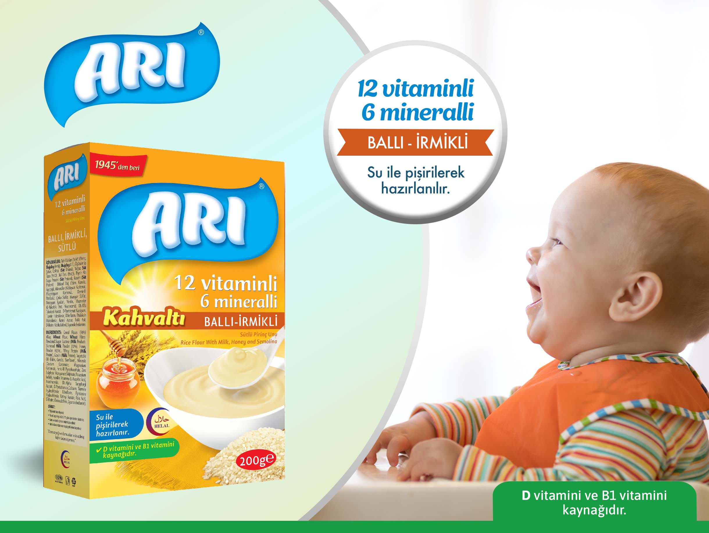 Arı sütlü Ballı İrmikli(Kahvaltı); Bebeklerin büyüdükçe artan enerji ihtiyacını karşılayacak olan bal ve besleyici tahıllardan biri olan irmik içerir. Arı Ballı -İrmikli 'yi kahvaltıda bebeğinize sunarak bebeğinizin güne sağlıklı ve enerji dolu başlamasını sağlayabilirsiniz. Bebeğiniz için 6. aydan itibaren güvenle tüketebileceğiniz Bal Tozu kullanılmıştır.