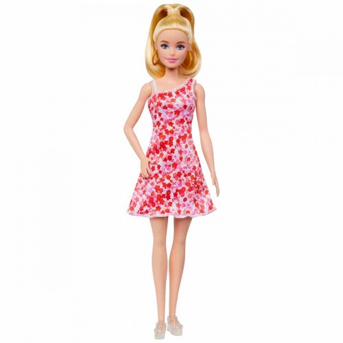 Çocukların gerçek dünyada gördüğü farklılıkları yansıtmak amacıyla tasarlanan Barbie Fashionistas bebekler, farklı hikayelere kapı açan parlak ve modaya uygun stiller sergiler. Bu Barbie bebeğin sarı saçları, eğlenceli tarzını tamamlamak için at kuyruğu şeklinde toplanmıştır. Altın renkli halka küpeleri ve platformlu renkli sandaletleri bebeğin şıklığını tamamlarken tarzını öne çıkarır.