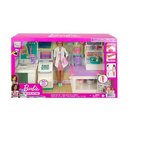 Kızlar, Barbie ile oynarken istedikleri her şeyi hayal edebilir ve hastalarla ilgilenmeyi seven kızlar Poliklinik işletebilir! Klinikte esmer Barbie Doktor Bebek (30 cm) ve 4 oyun alanı bulunur; sağlık istasyonu, muayene masası, röntgen makinesi ve hediyelik eşya dükkanı.