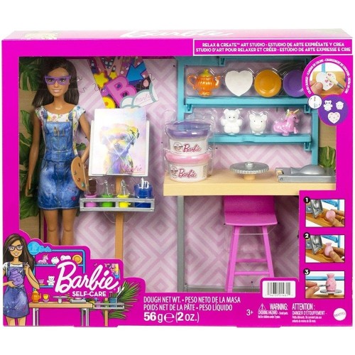 Bükülebilir dizli Barbie ve 25'ten fazla yaratıcılık parçası içerir: şövale, 2 adet resim, sandalye, 4 adet resim kovası, 2 adet Barbie oyun hamuru kabı, 3 adet dekorasyon aracı, 1 adet sünger fırça, 1 adet ressam paleti, 3 adet renk değişimi sergi parçası ve 7 ek sergi ve hikaye anlatımı parçası.