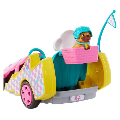 Dönen tekerlekleri, ekose tasarımı, çıkarılabilir bayrağı ve takılabilir köpek sepetiyle bu araba, Barbie® ve Stacie® to the Rescue adlı animasyon filminden çekilmiş gibi görünüyor.