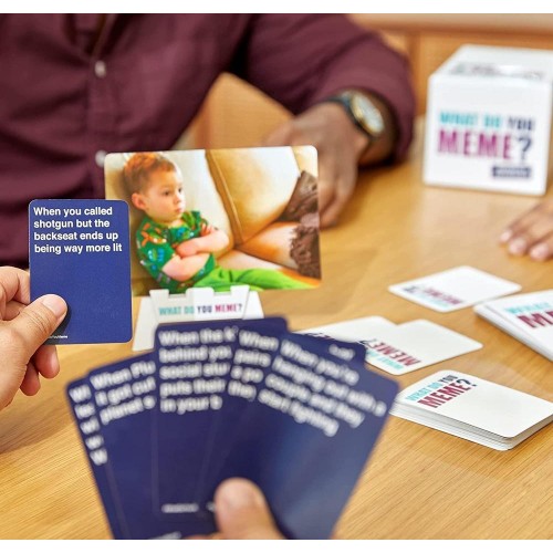 What do you meme? Core game - The hilarious adult party game for meme lovers How to play: Compete with your friends and family to create the funniest memes. Do this by using one of your dealt caption cards to caption the photo card in each round.Judge’s choice: The winner of each round is decided by a rotating judge. Pro tip: Pick your caption card to match the judge’s sense of humor.The og: This is the core game, so buy it first. You'll need it for all of our other expansion packs. Adults only: This game was created for ages 17+. There are some things you just can’t unhear. Trust us.What’s ınside: Each what do you meme core game contains 270 cards. 225 of these are caption cards and 45 are photo cards. Printed on premium playing cards (thick with gloss finish) includes an easel and bonus rules, shrink-Wrapped in a custom box.More hilarity: We also make other party games inspired by pop culture. Check out our store for tons more good stuff.