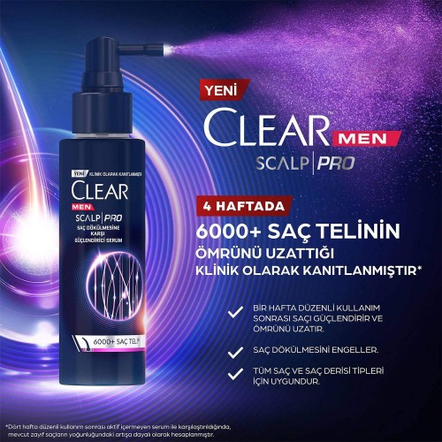 Saç dökülmesine karşı çözüm arayışında olan erkekler için Clear tarafından özel olarak üretilen bu uzman saç serumu, saç dökülmesine karşı ultra performans saç ve saç derisi çözümleri sunar. İleri düzey saç derisi ihtiyaçları için tasarlanan Clear Men Scalp Pro Saç Dökülmesine Karşı Güçlendirici Serum, saç dökülmesine karşı ultra performans sergiler. Saç dökülmesine karşı serumun etkin aktiflerle güçlendirilmiş formülüyle daha dolgun saçlar sağlar. Dört hafta düzenli kullanım sonrası 6000 saç telinin ömrünü uzattığı klinik olarak kanıtlanmıştır.* Clear’ın uzman saç bakımı sayesinde daha dolgun ve dökülmesi azalan saçlarınızla özgüveniniz her zaman tam!