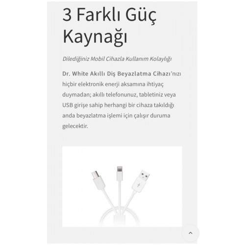 akıllı telefonunuz, tabletiniz veya USB girişine sahip herhangi bir cihaza takıldığı anda beyazlatma işlemi için çalışır duruma gelecektir. Her türlü cep telefonu girişine uyumlu çoklu ürün girişi mevcuttur. Siz ve sevdikleriniz güvenle Dr.White Akıllı Diş Beyazlatma Cihazını kullanabilir, dişlerinizin doğal beyazlığına kavuşabilirsiniz. Kullanım Talimatı: 1-Cihazı kullanmadan önce dişleriniz temiz ve kuru olmalıdır. 2-Uygulama öncesi Cihazı sıcak su ile yıkayıp kuruladığınızdan emin olun. 3-Cihaz beraberinde 2 adet Diş Beyazlatma Jeli ile birlikte gelir. Jeli ,gövdesinden sıkarak fırça yardımı ile dişlerinize uygulayınız. 4-Cihazı akıllı telefonunuza taktıktan sonra ağızlığı takarak 10 dakika süresince ağzınızdan çıkarmayınız. 5-İşlem tamamlandığında ağızlığınızı çıkartıp, ağzınızı su ile çalkalayarak dişlerinizi yıkayınız. 6-Bu işlemi en az 10 gün boyunca almak istediğiniz sonuca göre günde 1-2 kez uygulayınız.