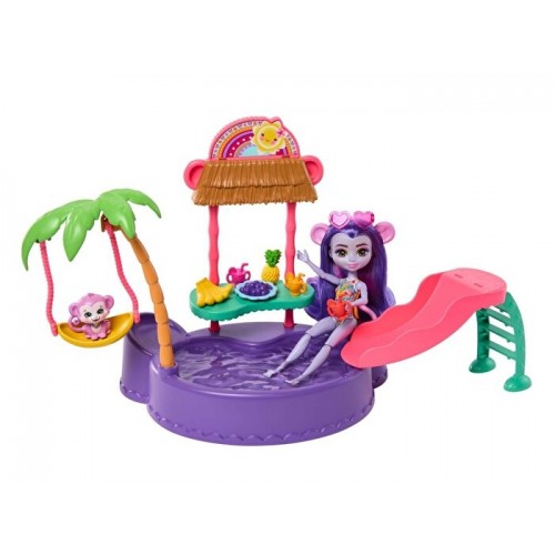 Bu oyun setine; maymun şeklinde havuz, sevimli bir mayo giyen ve kalp şeklinde gözlük takan, 15 cm uzunluğunda bebek ile hayvan dostu dahildir. Oyun seti ayrıca salıncak asılı bir palmiye ağacı, su kaydırağı ve sağlıklı atıştırmalıklarla dolu içecek standı gibi, 12'den fazla aksesuar içerir. Bu oyun seti çocuklara, en sevdikleri Enchantimals karakterleriyle havuz başında keyifli vakit geçirmeyi vadediyor.