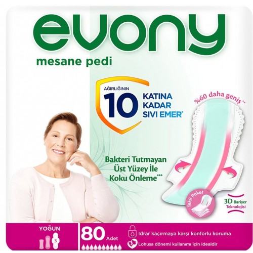 Evony Yoğun Mesane Pedi, beklenmeyen orta ve yoğun kaçırmaları için özel olarak üretildi. Günlük mesane pedlerinin özelliklerine sahip Evony Yoğun Mesane Pedi ayrıca;