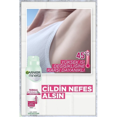 Garnier Mineral Termal Koruma sprey, içerdiği termoaktif bileşenler sayesinde 45ºC'ye kadar yüksek ısı değişimlerine ve stres gibi etkenlere rağmen ter kokusu ve ıslaklığa karşı 72 saat koruma sağlayan ilk* anti-perspirant sprey deodorant. Doğal ıslaklık emici mineral içeren formülü ile ıslaklığı sünger gibi emer. Koltuk altınızı ve giysinizi 48 saat boyunca kuru ve ferah hissetmenizi sağlarken cildinizin nefes almasına da izin verir. Alkol** içermez. Dermatolojik olarak test edilmiştir. * Garnier'in ** Etil Alkol