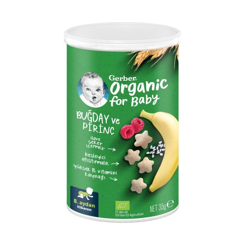 Gerber Organik Pirinçli, Buğdaylı, Muzlu ve Ahududulu atıştırmalık ile bebeğinizi keyifle besleyebilir ve ara öğünlerinde de kullanabilirsiniz.