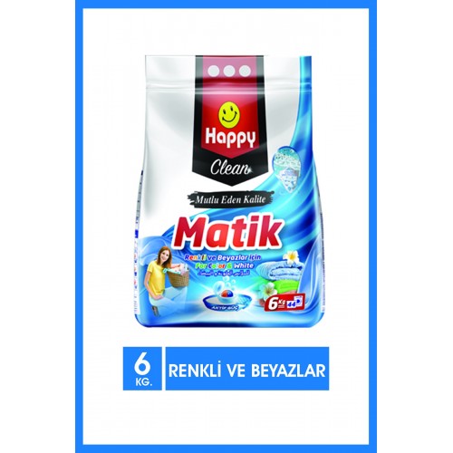 Happy Clean Toz Çamaşır Deterjanı, hem renkli hem de beyaz çamaşırlarınız için özel olarak geliştirilmiş etkili bir temizlik ürünüdür. 6 kg’lık ekonomik ambalajı sayesinde uzun süreli kullanım imkânı sunar.