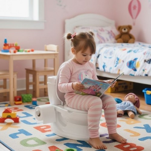 Gerçek tuvalet görünümüne sahip olan bu lazımlık, su sesi efektli sifonu ve ışıklı özellikleri sayesinde çocukların ilgisini çekiyor. Minikler, sifonu çekmeyi oyun gibi görerek tuvalet eğitimine daha kolay adapte oluyor.