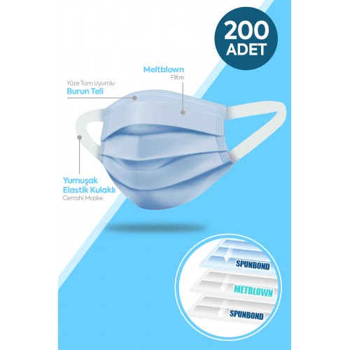 Happy Yumuşak Elastik Kulaklı 3 Katlı Telli Mavi Cerrahi Maske 200 lü