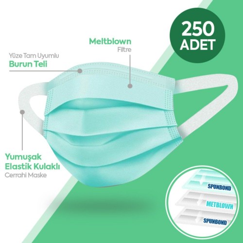 Happy Yumuşak Elastik Kulaklı 3 Katlı Telli Yeşil Cerrahi Maske 10x25