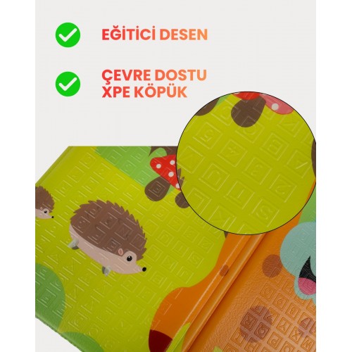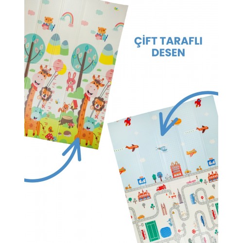 Özellikler: Çift Yönlü Kullanım: Oyun matımız, her iki yüzeyinde farklı desenlere sahip olup, çocuğunuzun hayal gücünü ve yaratıcılığını destekleyecek renkli ve eğlenceli tasarımlar sunar.