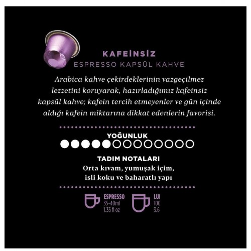Hazırlanışı; Kapsül kahvenizi Nespresso kapsülleri ile uyumlu bir makineye, makinenin hazırlama talimatlarına uygun hareket ederek yerleştiriniz. Makinenizi çalıştırma talimatına ve kutu üzerinde belirtilen hazırlama önerisine uygun olacak şekilde çalıştırınız ve kahvenizin fincana tamamen akmasını bekleyiniz. Afiyetle içiniz. Her kapsül tek kullanımlıktır.