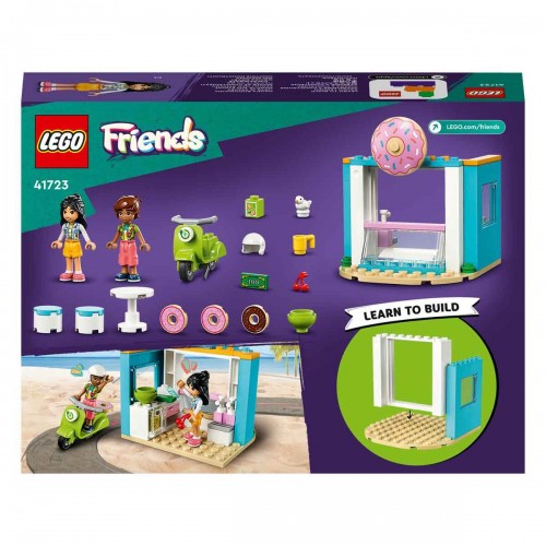 4 yaş ve üzeri küçük makarnacılar, LEGO Friends Donut Dükkanı yapım setiyle hikayeler yaratma bayılacak. Bu yaratıcı oyuncak, çocuklar sanatsever Liann ve hamur işi meraklısı Leo ile yaratıcı bulmaya onları model yapan öğretici. Liann'ın iyimserliği ve hevesi, şehre yeni taşınan Leo'ya harika bir arkadaş olmasını sağlar. Kâse, meyveler, bardak, 3 donut, meyve suyu, para, 2 sandalye ve masa gibi aksesuarlar, çocuklar için atıştırmalıklar hazırlarken oyunla öğrenmelerine yardımcı olur.