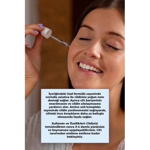 İçeriğindeki özel formülü sayesinde centalla asiatica ile cildinize yoğun nem desteği sağlar. Ayrıca cilt bariyerinin onarılmasını ve cildin sıkılaşmasına yardımcı olur. Amino asit kompleks sayesinde cildin yenilenmesini sağlayarak, ciltteki ince kırışıkların daha az belirgin olmasında fayda sağlar. Kullanım ve Özellikleri: Cildinizi temizledikten sonra 3-4 damla yüzünüze ve boynunuza uygulayabilirsiniz. Cilt tarafından emilene emilene kadar bekleyiniz. Uyarılar / Önlemler: Çocukların ulaşamayacağı yerlerde saklayınız. ve parti numarası ambalajın altındadır. 25°C’nin altındaki oda sıcaklığında ve kuru yerde saklayınız. Direkt güneş ışığına maruz bırakmayınız.Sadece harici kullanım içindir. Ingredients / İçindekiler:Aqua, Propylene Glycol, Centella Asiatica Leaf Extract, Glycerin, Pentylene Glycol, Phenoxyethanol, Centella Asiatica Flower/leaf/stem Extract, Madecassic Acid, Asiatic Acid, Asiaticoside, Hydroxyethylcellulose, Niacinamide, Benzyl Alcohol, Allantoin, Betaine, Ethylhexylglycerin, Tetrasodium Edta, Sodium Benzoate, Sodium Pca, Sodium Lactate, Potassium Sorbate, Propanediol, Arginine, Aspartic Acid, Camellia Sinensis Leaf Extract, Chamomilla Recutita Flower Extract, Triticum Vulgare Seed Extract, Pca, Hydrolyzed Glycosaminoglycans, Sodium Hyaluronate, Glycine, Alanine, Serine, Valine, Hyaluronic Acid, Hydrolyzed Hyaluronic Acid, Sodium Hyaluronate Crosspolymer, Isoleucine, Proline, Sodium Hydroxide, Threonine, Histidine, Phenylalanine, Benzoic Acid, Dehydroacetic Acid