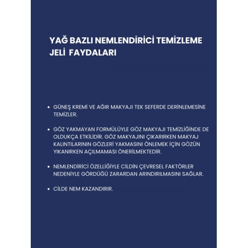 Cildinize nazik ancak etkili bir temizlik sunan yağ bazlı yüz yıkama jelimiz, günlük makyajınızı, ağır kirleri ve güneş kremi kalıntılarını kolayca temizler. Özel formülü, cildinizi kurutmadan derinlemesine temizler ve taze bir his bırakır. Tüm cilt tipleri için uygundur ve gözeneklerinizi tıkamadan cildinizi ferahlatır. Sağlıklı ve pürüzsüz bir cilt için tercih edilen yüz temizleyici jelimizi hemen deneyin!
