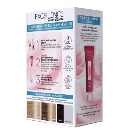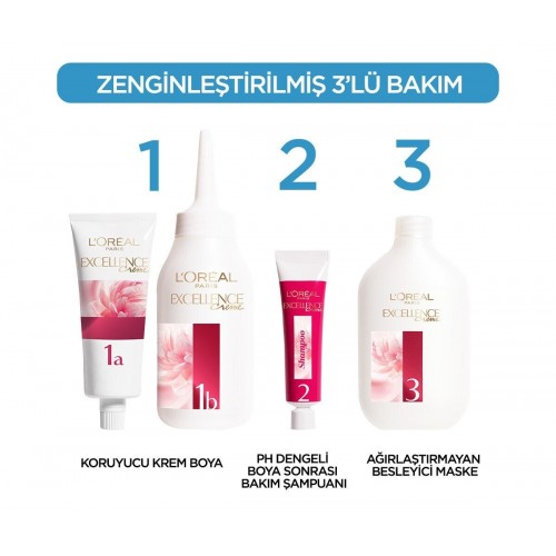 Üç aşamalı komple bakım.Pro-keratin + Seramid + Ionene G ile güçlendirir, korur, yeniler. 100% beyaz kapama. Zengin, parlak, uzun süre kalıcı saç rengi. Excellence Krem Boya zenginleştirilmiş 3'lü bakım ile saçlarınızı güçlendirir, korur ve yeniler. Dirençli beyazlarda bile %100 beyaz kapama sağlarken saçlarınız daha zengin, parlak ve uzun süre kalıcı mükemmel renk sonucuna ulaşır. Boya Öncesi Koruyucu Serum' u saçlarınızın her yerine uygulayın. Krem Saç Boyasını, Oksidan Krem şişesinin içine dökün ve kapağı kapadıktan sonra iyice çalkalayın. Saçınıza uygulayın. 30 dakika bekleyin ve saçlarınızı su ile duruladıktan sonra Boya Sonrası Koruyucu Bakım Kremi' ni uygulayın.
