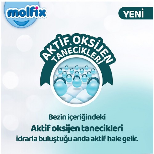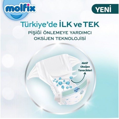 Molfix Premium Oksijen Teknolojisi, yüksek emici özellikleri ile sıvıyı hızlıca emerek bebek cildinin kuru kalmasını sağlar.