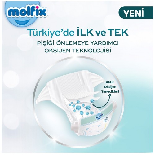 Molfix Premium Oksijen Teknolojisi, yüksek emici özellikleri ile sıvıyı hızlıca emerek bebek cildinin kuru kalmasını sağlar.