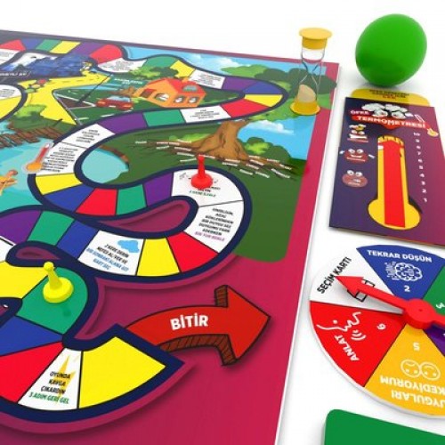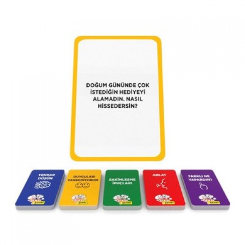 Oyun İçeriği : Oyun panosu, 5 çeşit 128 adet kart, 1 dakikalık kum saati, 1 stres topu, kartları belirleyici çark, öfke termometresi, 4 adet piyon içerir.