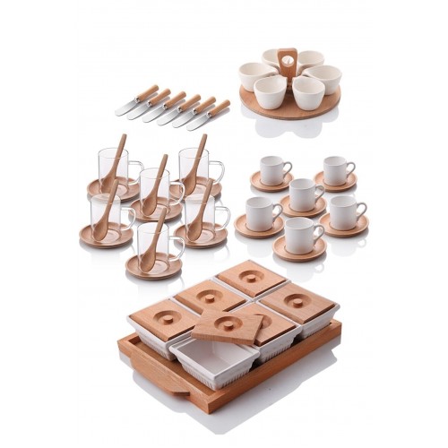 Tüm ahşap parçalar 1,sınıf Kayın ağacından imal edilmiştir,Beyaz parçalar 1,sınıf seramikten imal edilmiştir,Çay kupaları 1, sınıf Borasilikat camdan imal edilmiştir