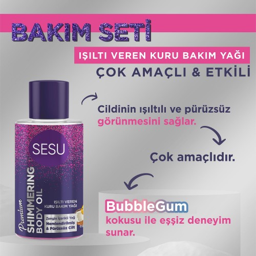 Sesu Işıltı Veren Kuru Bakım Yağı, ağda ve tüy dökücü krem sonrası cildini nemlendirmeye yardımcı olur ve cilde bakım yapar. BubbleGum kokusuyla yeni bir deneyim sunar! Cilde ışıltılı ve pürüzsüz bir görünüm kazandırır. Hindistan cevizi yağı ile cildi nemlendirir, ihtiyacı olan bakımı sağlar."