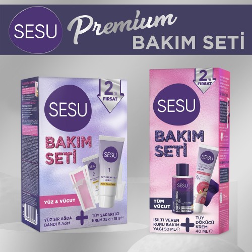 "Sana özel Sesu Premium Bakım Seti yüzünü güldürecek! Tüy Dökücü Krem ve Işıltı Veren Kuru Bakım Yağı’ndan oluşan bu setle pratik çözüme ulaş.