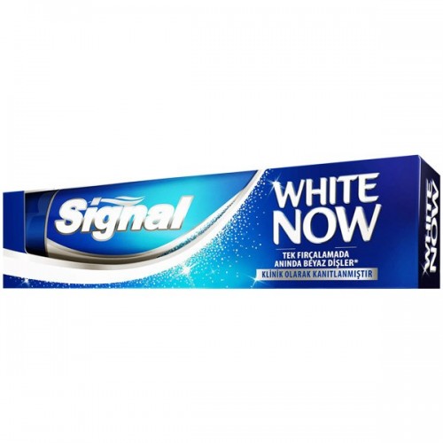 Signal’in son teknolojiyi kullanarak geliştirdiği anında beyazlatan diş macunu Signal White Now! Dişlerinize zarar vermeden anında ve daha beyaz gözükmesini sağlayan Signal White Now içeriğindeki florürle bir diş macununda bulunan tüm koruma özelliklerine sahiptir. Uzun süreli kullanımda kalıcı beyazlık sağlayan Signal White Now, taze nane lezzeti ile de uzun süreli yoğun ferahlık sunuyor.