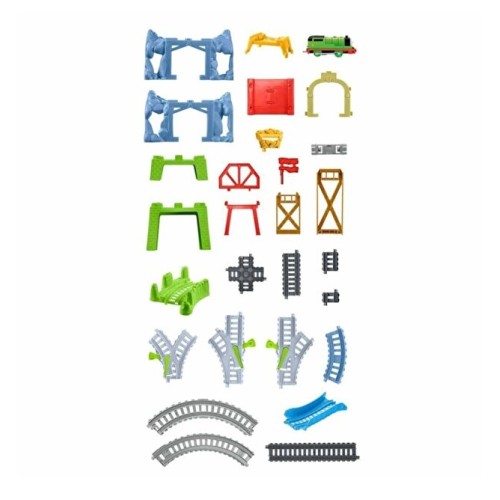 -TrackMaster Percy Büyük Macera 6 Farklı Kurulum seti, mağara, köprü ve tünel parçaları ile beraber gelir.