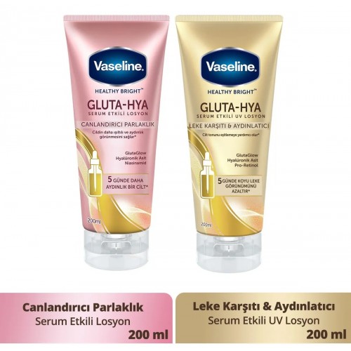 Adını GlutaGlow teknolojisi ve Hyalüronik Asit'ten alan Vaseline Gluta-Hya serisi, GlutaGlow içeren formülü ile ışıltısını kaybetmiş cildinizi aydınlatır ve parlaklık sağlar. Formülündeki Hyalüronik Asit ile cildinizi derinlemesine nemlendirir. Cilt bakımının en sevilen içeriklerinden biri olan Pro-Retinol ile özel olarak formüle edilen Vaseline Gluta-Hya Serum Etkili UV Losyon Leke Karşıtı & Aydınlatıcı, eşit bir cilt tonu elde etmenize yardımcı olur*. Bu eşsiz formül, cildinizdeki ton farklılıklarını azaltarak, pürüzsüz bir görünüm sağlar. UVA ve UVB koruması ile zenginleştirilen Gluta-Hya Serum Etkili UV Losyon, cildinizi zararlı güneş ışınlarına karşı korur**, böylece cildiniz hem güneşin olumsuz etkilerinden korunur hem de doğal ışıltısını kaybetmez. Su bazlı formülü sayesinde uygulandığı bölgede hızla emilen Vaseline Gluta-Hya Serum Etkili Losyon, yağlı ve yapışkan bir his bırakmaz. Serum etkili formülü ile nemi cildinize hapseder ve ilk kullanımdan itibaren cildinizin nemli kalmasını sağlar.